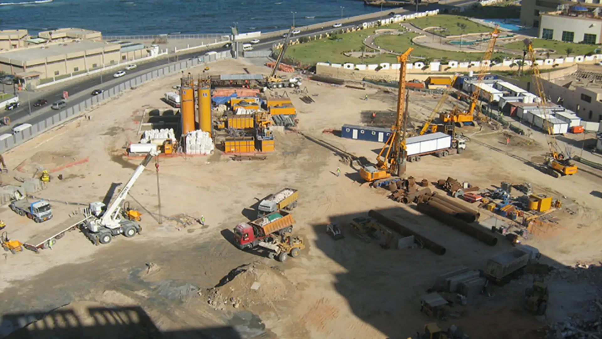 Bauer Egypt undertook a key project in Tripoli's coastal Souk al Talat area, known for its luxury hotels. The development includes two towers for hotel and office use, featuring a four-level basement with car parking and water tanks. Our expert's work involved constructing 12,000 m² of diaphragm walls at 22 m depth, installing 510 piles (1,000 mm diameter) and 554 piles (1,200 mm diameter), both 45 m long, with compression loads of 472 and 679 tons respectively, along with 1,050 ground anchors to secure the structure.