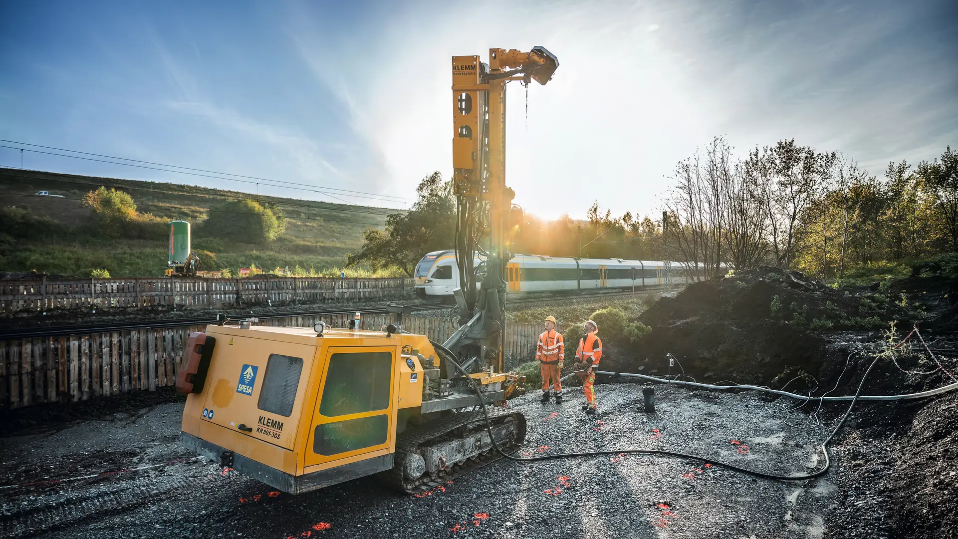 SPESA Spezialbau und Sanierung GmbH was tasked by the city of Dortmund to carry out foundation and soil improvement measures for the new building of the “Haldensprung” pedestrian and bicycle bridge. “For the foundation, we will install a total of 140 micropiles on the individual foundations of the new bridge,” explains Sebastian Otto, Project Manager at Spesa. “We will also execute 2,100 m of soil improvement using the low-pressure erosion method developed by Spesa.” One KLEMM KR 805 and one KLEMM KR 801 drilling rig are in use for the specialist foundation engineering works, as well as three employees per drilling rig. Because work is being carried out on an undeveloped site, it was also necessary to establish the full electrical and water supply. “We also constructed a temporary scaffolding overpass for pedestrians over the adjacent tracks,” continues Sebastian Otto. The work started in May 2024 and is expected to be completed by February 2025. This will lay the foundation for Dortmund’s garden of the future, which is sure to inspire visitors in 2027.