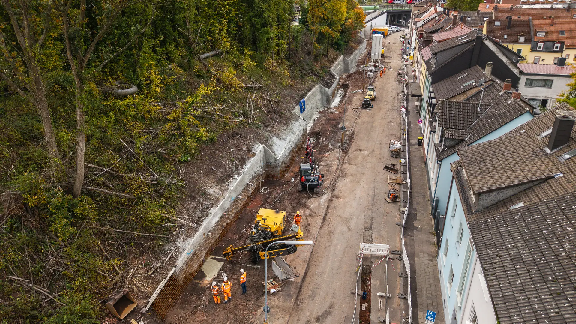 The slope stabilization was successfully completed in October. Subsequent work starts with the construction of a gabion wall as visual cladding for the slope reinforcement. The actual road expansion is planned for spring 2026 and should be completed in fall of the same year.
